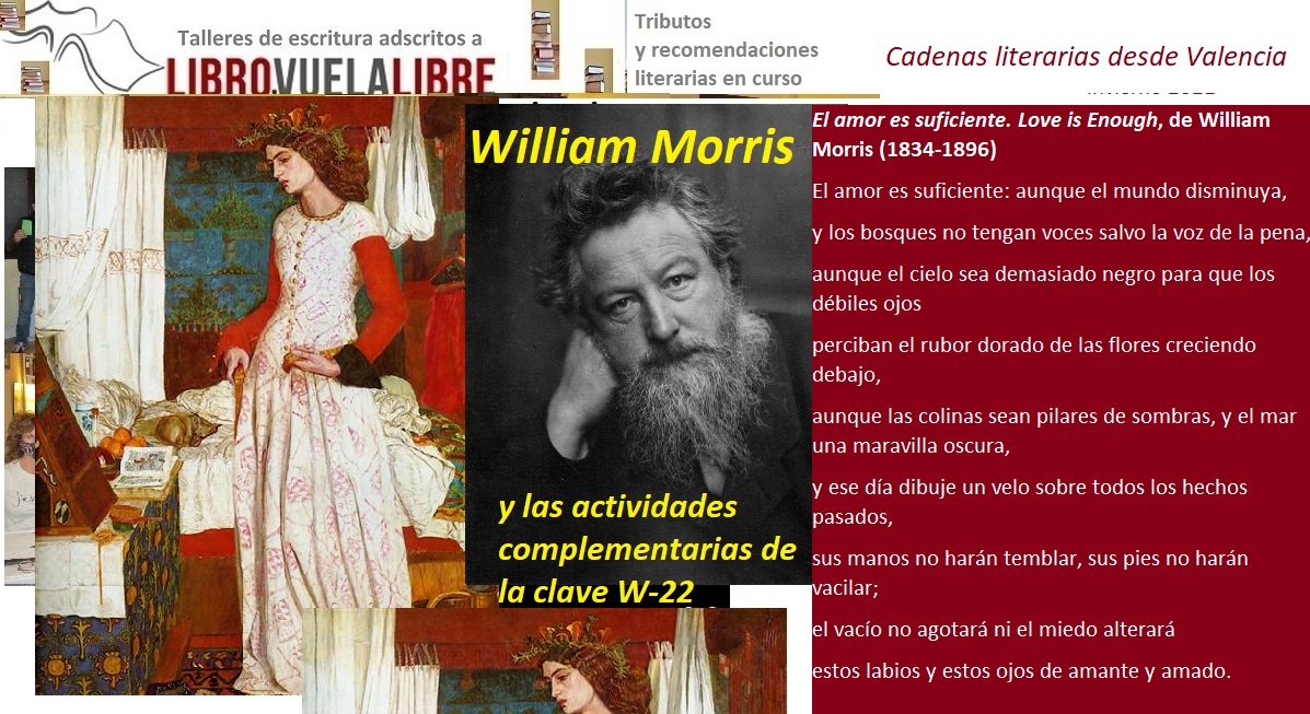 Disfruta de las siguientes puertas de entrada de La reina campesina y La casa de los lirios, las dos novelas breves de juventud de William Morris elegidas por el club de lectura de nuestros talleres de escritura a distancia y presenciales en Valencia para inspirar las actividades complementarias de la clave W-22, y de El amor es suficiente, el poema de este autor prerrafaelista que dará origen al disparador creativo de dicha clave.