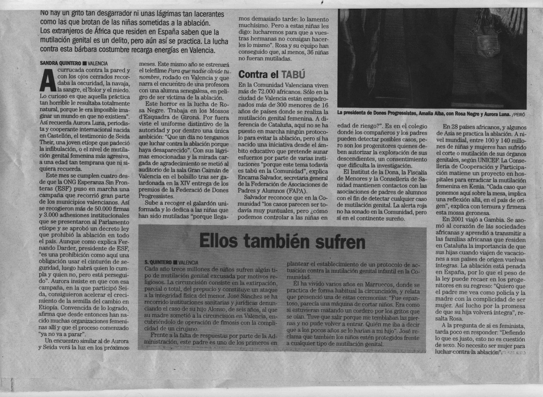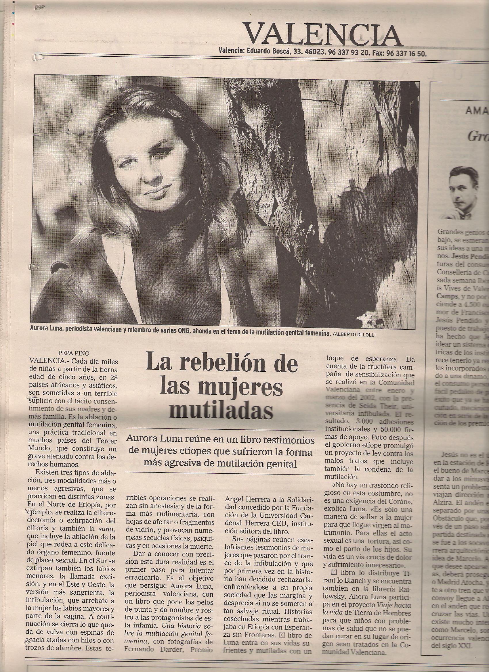 » Dar a conocer con precisión esta dura realidad es el primer paso para intentar erradicarla. Es el objetivo que persigue Aurora Luna, periodista valenciana, con un libro que pone los pelos de punta y da nombre y rostro a las protagonistas de esta infamia. ‘Una historia sobre la mutilación genital femenina’, con fotografías de Fernando Darder, Premio Àngel Herrera a la Solidaridad concedido por la Fundación de la Universidad Cardenal Herrera-CEU, institución editora del libro.