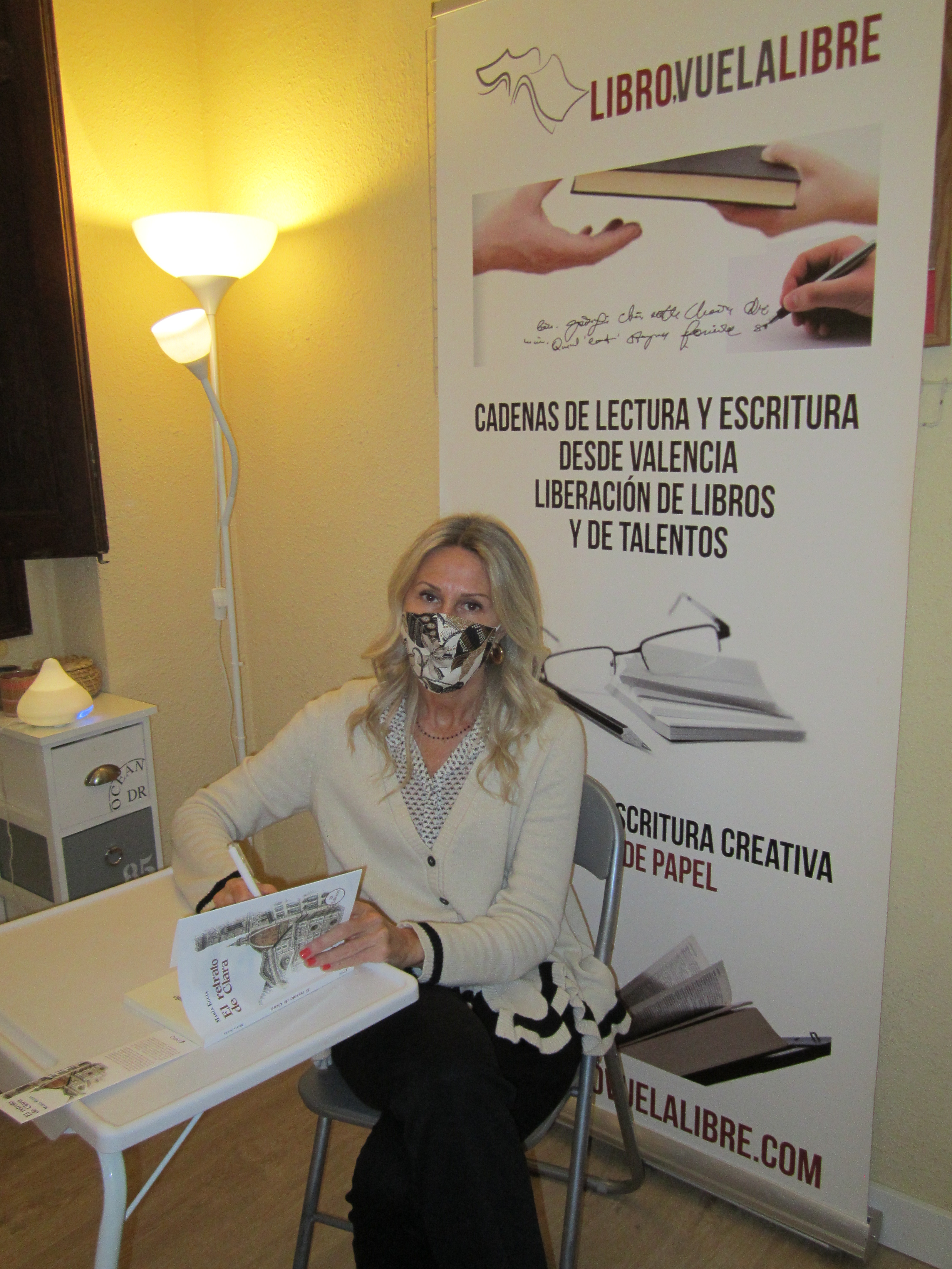 María Eguía, antigua integrante de Cada mirada es única, la antología que recoge la liberación de talentos de los talleres literarios de Libro vuela libre, acaba de dejar un ejemplar firmado de su última novela,El retrato de Clara, en la biblioteca de talentos de nuestracomunidad de escritores en Valencia.